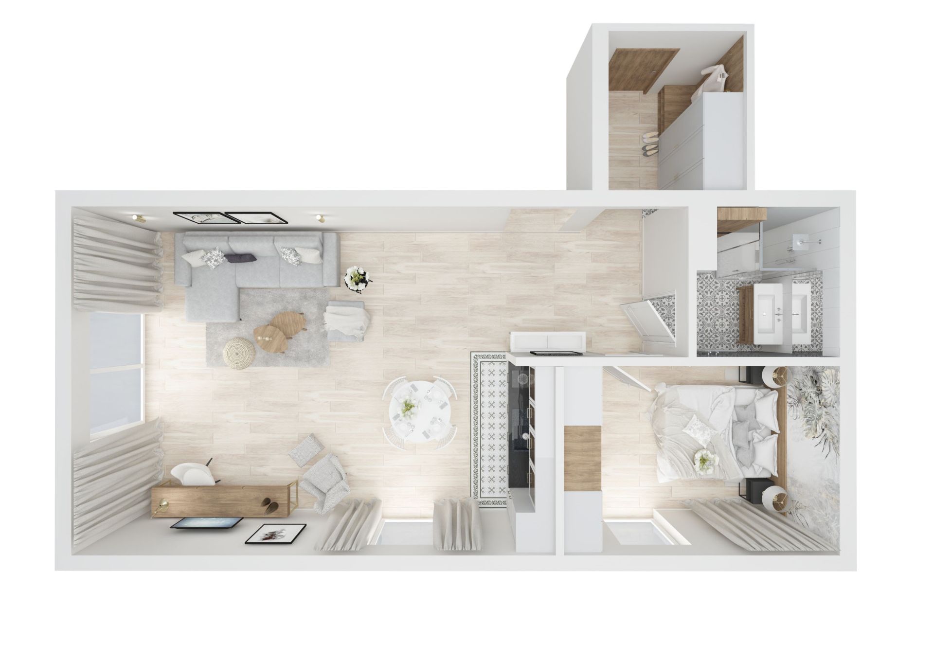 Salon: rozkładana kanapa z funkcją spania, 140x200 plus dodatkowy toper w celu zapewnienia maksymalnego komfortu podczas snu, stolik,  biurko z krzesłem oraz lampką.