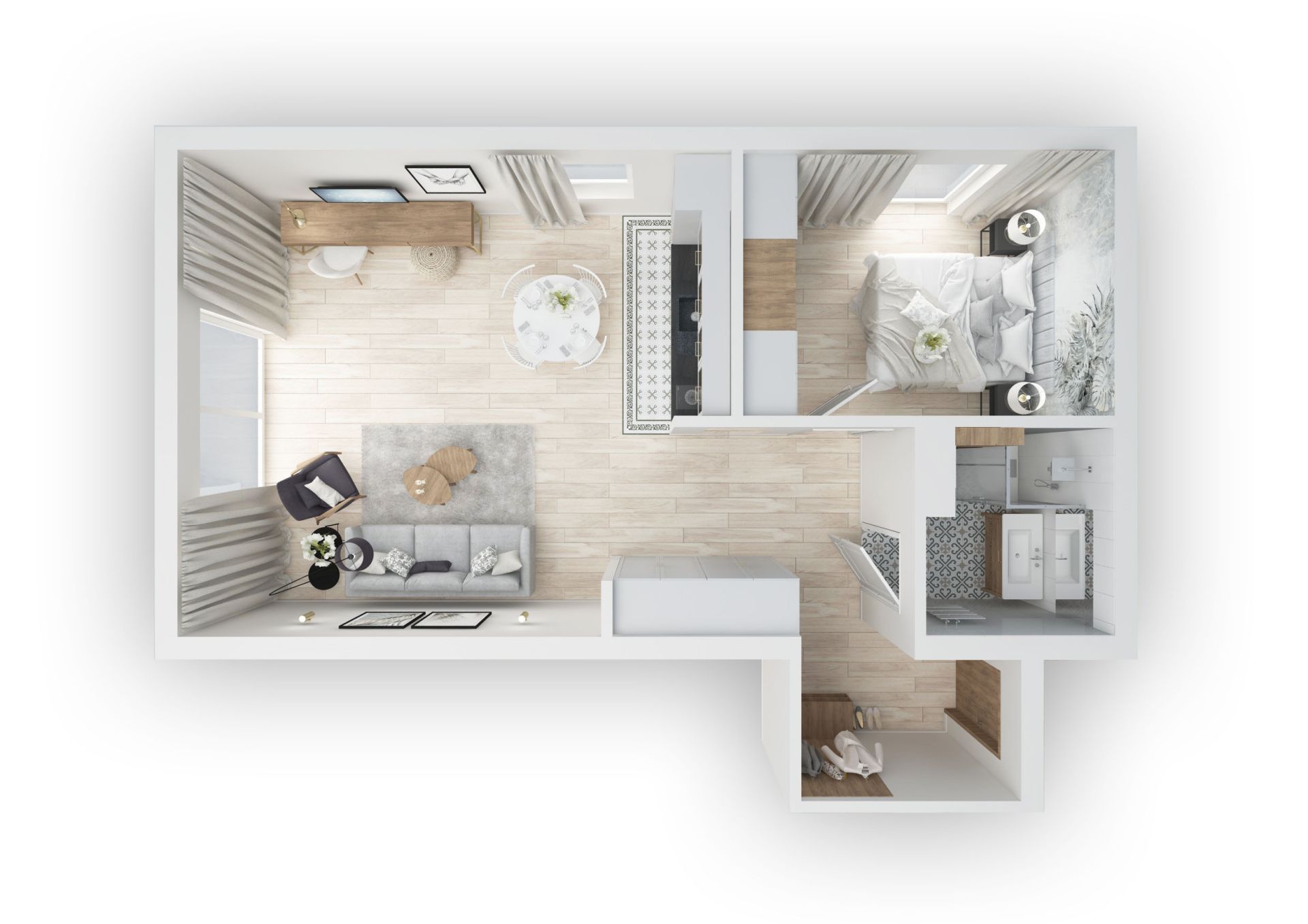 Salon: rozkładana kanapa z funkcją spania, 140x200 plus dodatkowy toper w celu zapewnienia maksymalnego komfortu podczas snu, stolik, biurko z krzesłem oraz lampką.